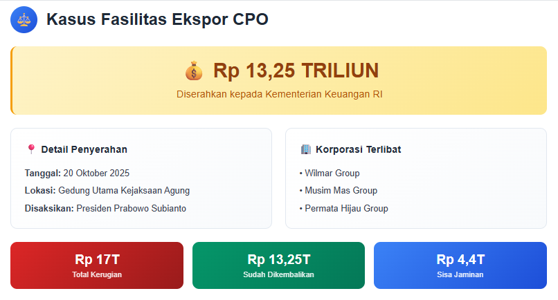 Menurutnya, total kerugian negara akibat kasus ini mencapai Rp17 triliun. Dan dari jumlah itu, Rp13,25 triliun sudah berhasil diserahkan hari ini.